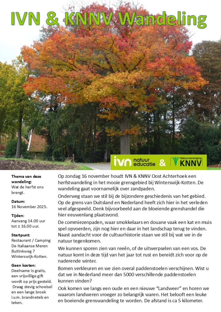 Op zondag 16 november houdt IVN & KNNV Oost Achterhoek een herfstwandeling in het mooie grensgebied van Winterswijk-Kotten. De wandeling gaat voornamelijk over zandpaden.